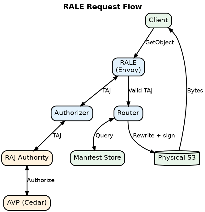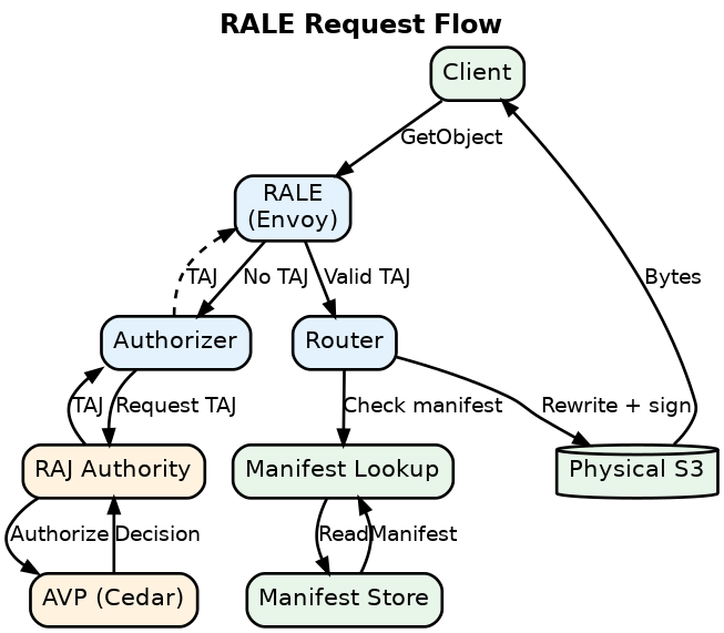Authorization happens once via RAJ tokens – cryptographically signed tokens containing compiled authorization. No policy lookups on subsequent requests. RALE uses TAJs (Translated Access JWTs), which are RAJs granting authority over specific package manifests.