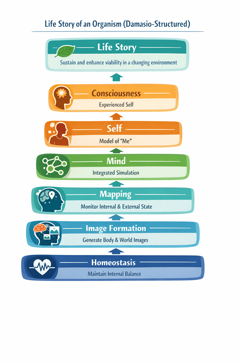 The Life Story stack is therefore a structural restatement of Damasio’s central thesis: