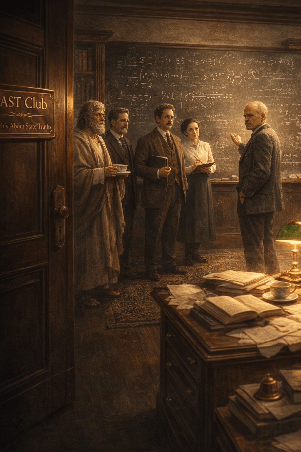 A severe, elegant study. Chalk dust everywhere. On the wall: axioms, symbols, consistency proofs, and half-erased diagrams.